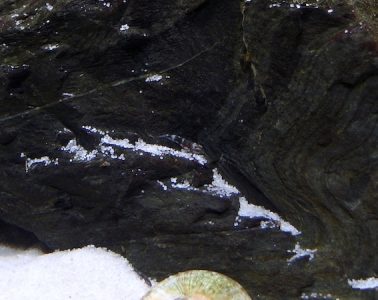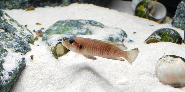 Młody Lamprologus ocellatus w niecodziennej kryjówce
